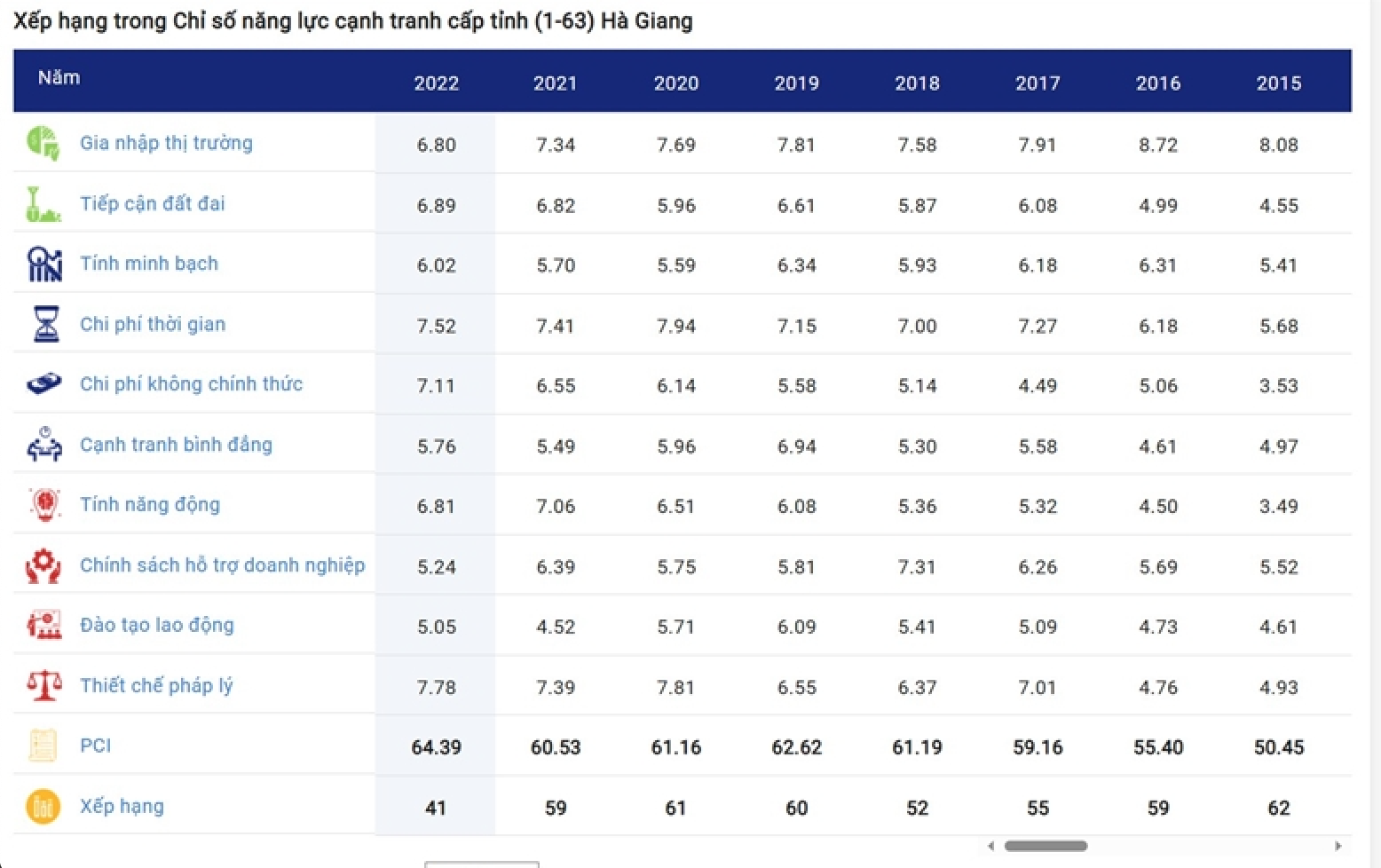 Qua phân tích 10 chỉ số thành phần PCI, Hà Giang tăng điểm ở nhiều chỉ số. Trong đó, một số chỉ số thành phần tăng cao như: Chi phí không chính thức từ 6,55 điểm năm 2011 tăng lên 7,11 điểm năm 2022; thiết chế pháp lý từ 7,39 điểm lên 7,78 điểm.